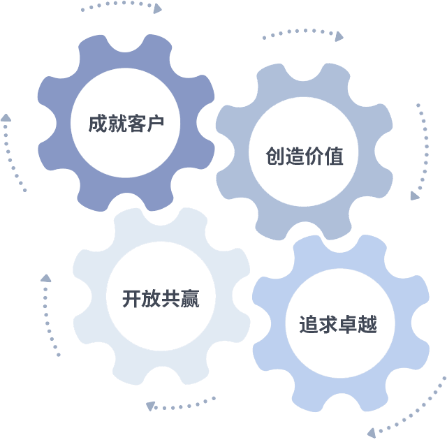 成就客户是一切决策的出发点,,,,创造价值是衡量所有工作的标准,,,追求卓越是CQ9电子做事做人的态度,,,,开放共赢是CQ9电子的格局也是最终的结果。。。。价值观的齿轮环环相扣,,推动着组织里的每个人不断向前。。